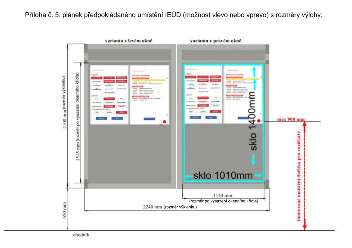 Příloha č. 5 - Plánek předpokládaného umístění IEÚD. | Plánek předpokládaného umístění IEÚD, včetně fotografií výlohy určené k umístění IEÚD, které jsou umístěny zvlášť. | zadávací dokumentace |